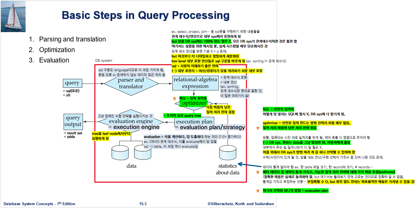 - Query Language(์ง์์ด), Declarative DML (์ ์ธ์ DML) ํ์ฑ, ๋ฒ์ญ โก Relational Algebra (๊ด๊ณ ๋์) ํํ์ผ๋ก ๋ณํ โก Metadata๋ฅผ ํ์ฉํ์ฌ Query Optimization (์ง์ ์ต์ ํ) โก Execution Plan