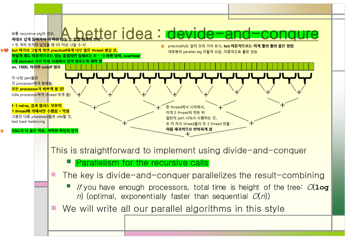 - parallel 이후, 각 thread의 결과를 reduce할 때 Divide & Conquer 활용 가능