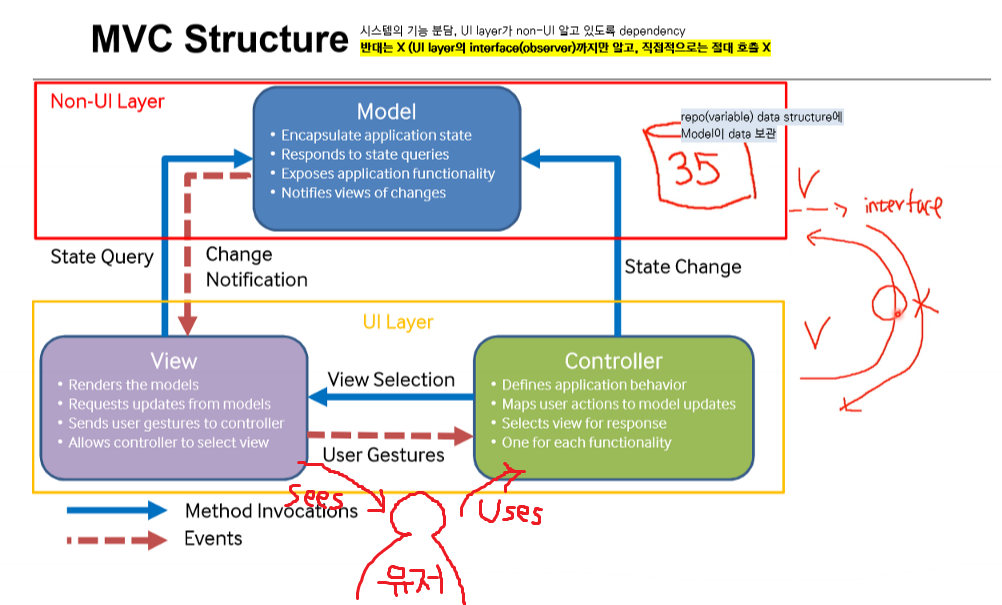 • โญ UI์˜ ๋ณ€ํ™”๊ฐ€ Non-UI = Model์—๊ฒŒ ์ „ํŒŒ๋˜์ง€ ์•Š๋„๋ก ํ•˜๊ธฐ ์œ„ํ•จ โžก Non-UI์˜ ๊ฒฝ์šฐ UI์˜ Interface๋งŒ ์•Œ๊ณ  UI์˜ Module๊ณผ๋Š” ๋…๋ฆฝ์„ฑ ๊ฐ€์ง (UI๋Š” Non-UI ์•Œ์•„๋„ ์ƒ๊ด€ ์—†์Œ)
