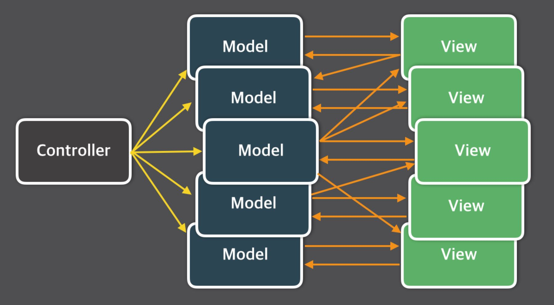 2. Massive View Controller: ๋Œ€๊ทœ๋ชจ ์• ํ”Œ๋ฆฌ์ผ€์ด์…˜์—์„œ, ๋‹ค์ˆ˜์˜ Model, View๊ฐ€ Controller์™€ ๋ณต์žกํ•˜๊ฒŒ ์—ฐ๊ฒฐ๋˜๋Š” ๊ฒƒ